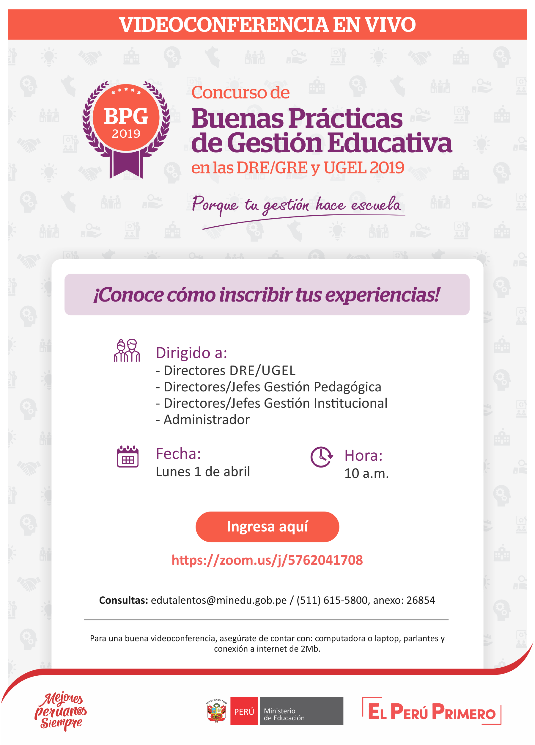 17Curso Mejora de Procesos para la gestión de las DRE y UGELCurso Mejora de Procesos para la gestión de las DRE y UGELHora: 2:30 pm - 3:30 pm Tema: Curso Mejora de Procesos para la gestión de las DRE y UGEL. Sesión de repaso.